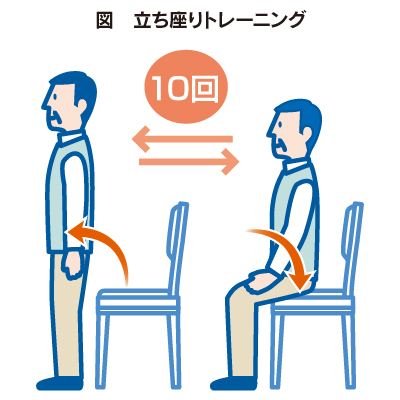 サルコペニアを予防するために大切なものは適度な運動です。特に、レジスタンス運動(筋力トレーニング)はサルコペニアの予防に有効です。レジスタンス運動とは筋肉に負荷をかける動作を繰り返すものです。椅子に座った状態からゆっくりと立ち上がり、再びゆっくりと椅子に腰掛けることを繰り返す運動(図)などは下肢筋力の維持に有効です。ただし、痛み・動悸・息切れなどの症状がある方、通院中の方は運動を開始する前に担当医に確認をお願いします。
