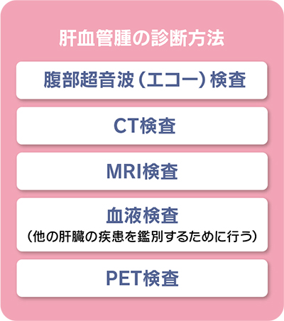 肝血管腫は一般的に、健康診断や人間ドックのときに腹部画像検査、特に腹部超音波検査で発見されることが多くなります。確定診断には造影剤を使用したCT検査、MRI検査などの画像検査を行いますが、極めて特徴的な造影パターンが見られるため、診断は比較的容易になります。多くの場合は自他覚症状なく予後にも影響はないため、治療の必要性はありませんので、健康診断や人間ドックなどで定期的に画像フォローを受けていただくのみとなります。