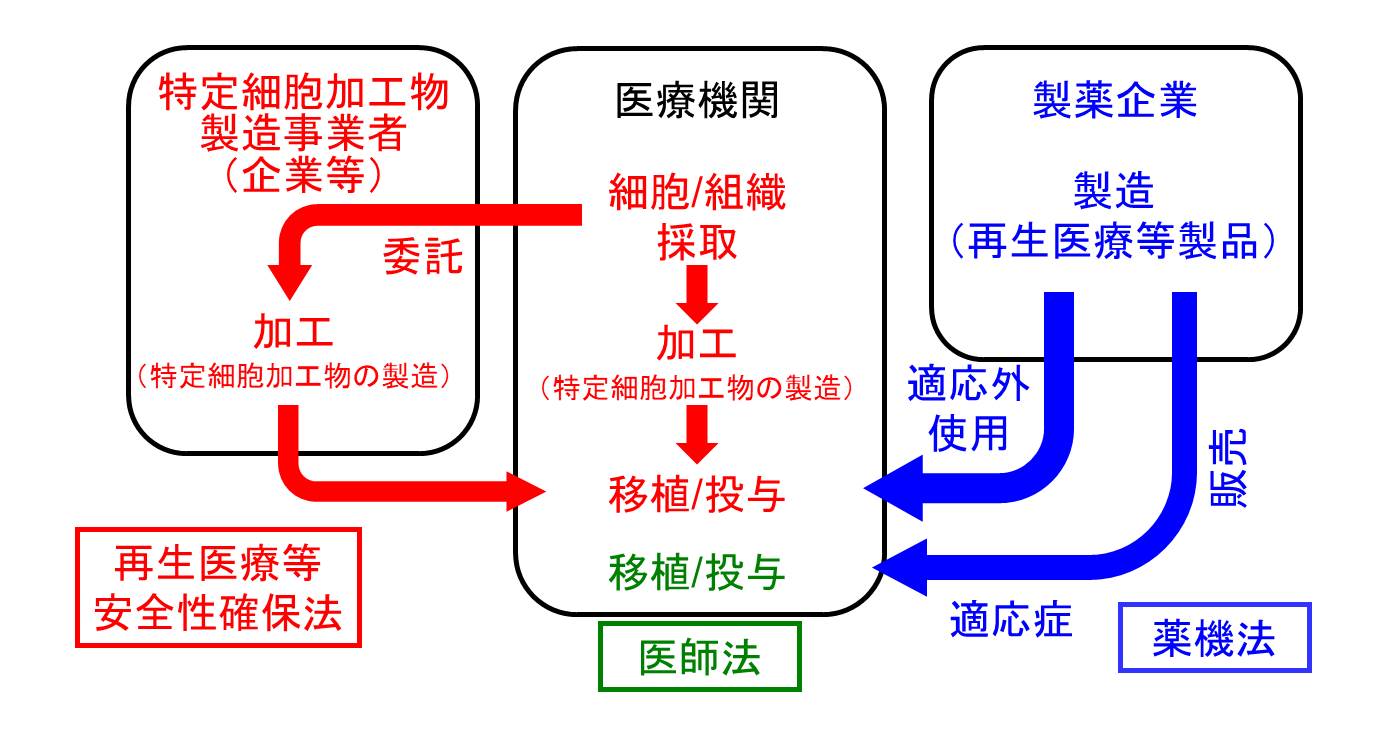 なお、後述する薬機法のもと製造販売承認を受けた再生医療等製品を適応症に対して投与する場合は通常の医薬品と同様に医師法の規制をうけるのみですが、再生医療等製品であっても適応外の疾患に対して臨床研究あるいは治療として投与を行う場合にはこの再生医療等安全性確保法の対象となります。 -