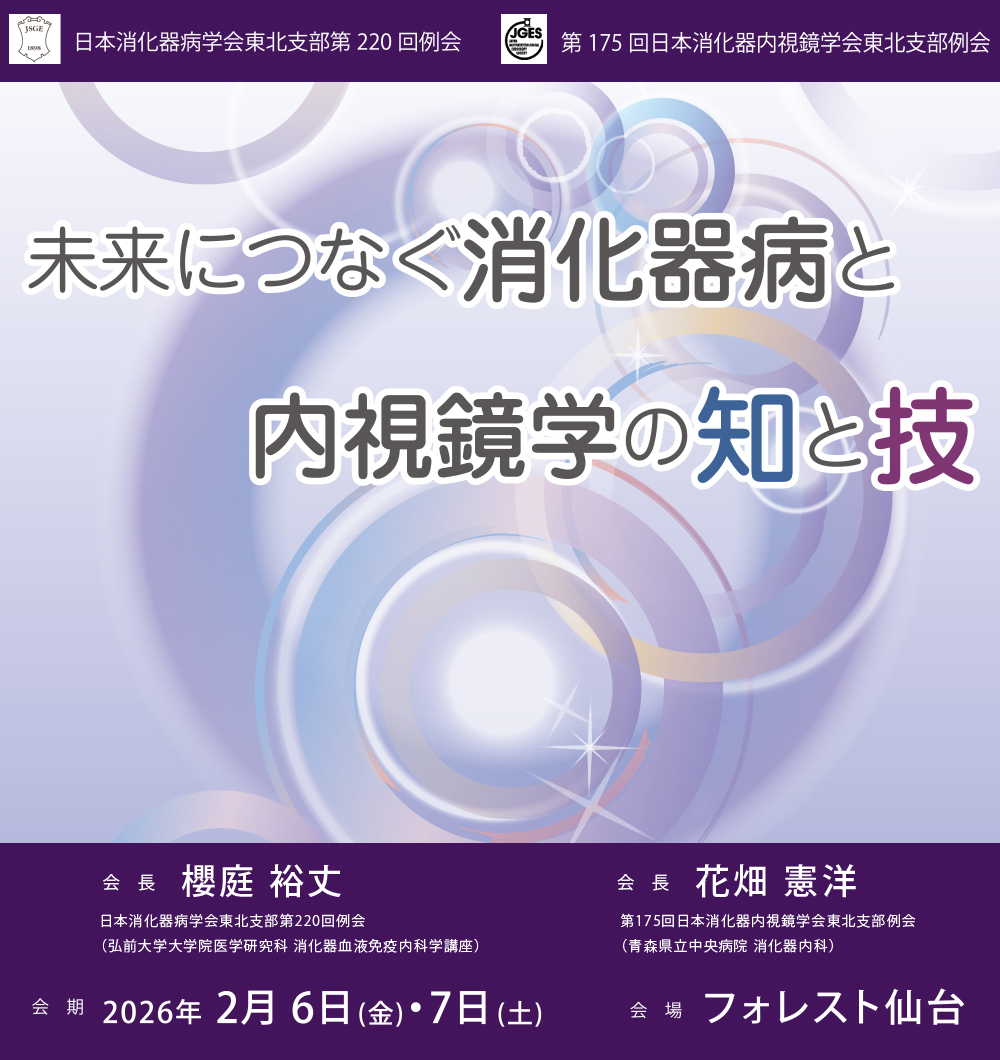 内 容 | ※第175回日本消化器内視鏡学会東北支部例会と合同開催。 詳細については、例会HPをご参照ください。 ![]() 特別講演 シンポジウム(公募) 1.消化器疾患の継往開来 2.診療科横断的な消化器病診療の現状と課題 特別シンポジウム (公募)「シニアからの提言:若手に伝えたい、ベテラン消化器病・内視鏡医の心に残る症例・研究」 特別企画 目指せ!消化器病専門医-研修医からの報告 (公募)特別企画 目指せ!消化器病専門医-専攻医からの報告(公募) ※卒後2年目までの研修医、卒後3-5年目までの専攻医による症例報告等の発表を併せて20題募集します。 なお、特別企画の選考に漏れた場合は、一般演題として採用します。 一般演題(公募) 専門医セミナー(2026年02月06日(金)10:40-11:50(予定)) 「覚えておきたい消化器内科の希少疾患」 遺伝性・非遺伝性を問わず、頻度が低く、診断や治療に難渋する消化器疾患の中には、生涯で遭遇する機会がほとんどないものもあります。しかし、専門医として知っておくべき重要な疾患も少なくありません。本セッションでは、そのような希少消化器疾患について、実際の症例を提示しながら議論いたします。 |