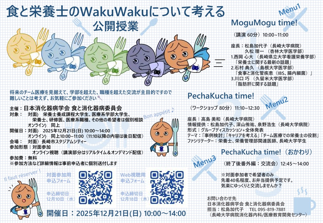 この度、本学会「食と消化器病委員会」では、栄養士養成課程大学生・医療系学部大学生・栄養士・研修医・医療系職種の方々を対象に、公開授業を実施することとなりましたので、ご案内申し上げます。